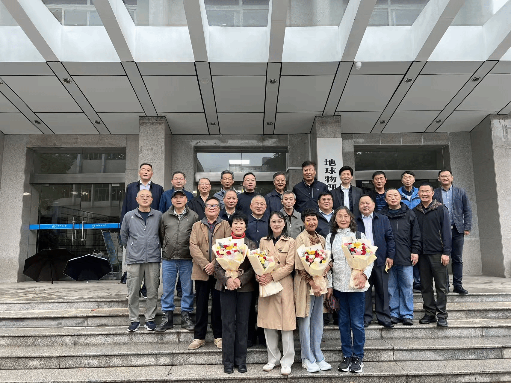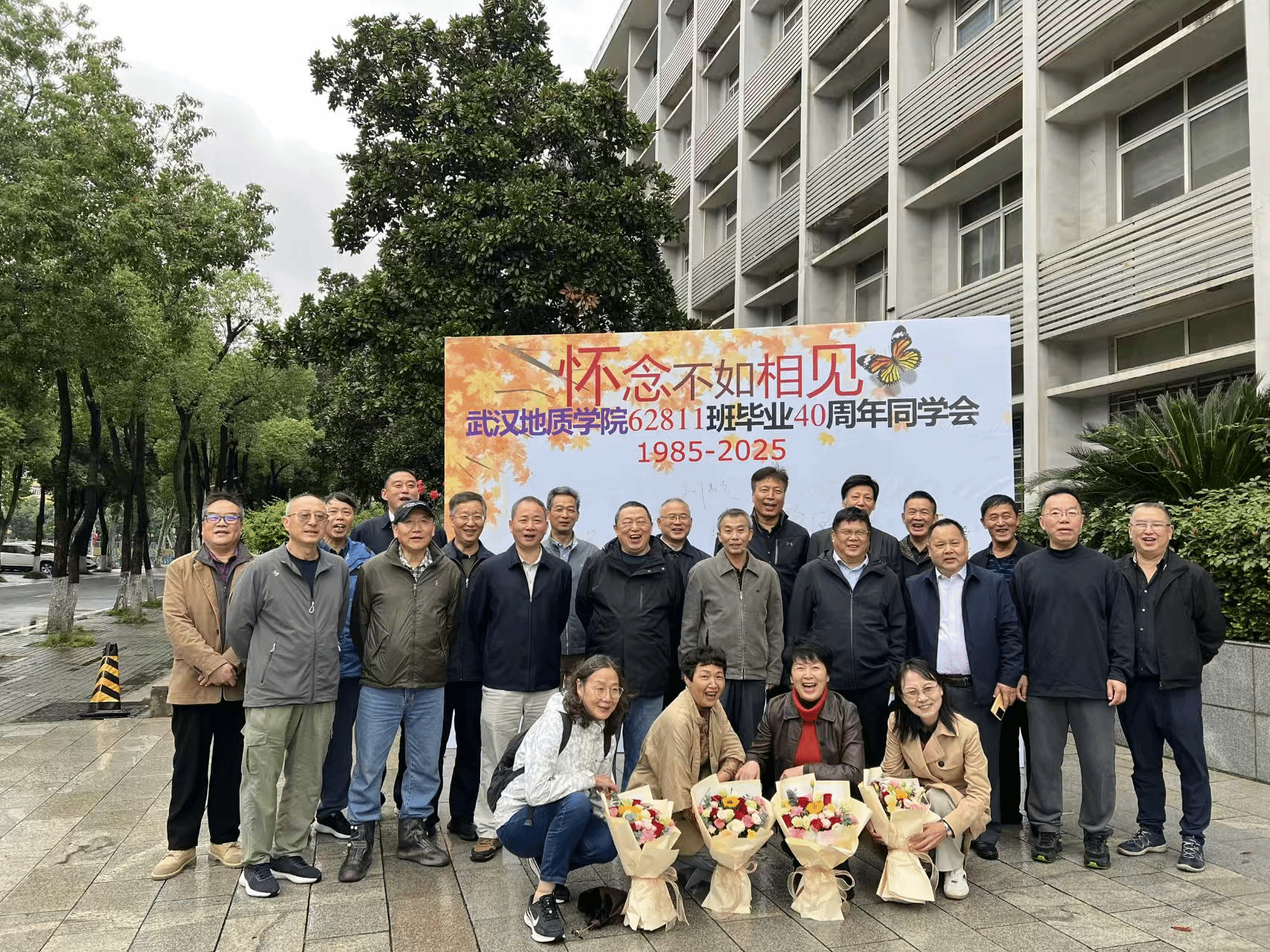 此次聚会获学院重视与厚待。党委书记马彦周在学院门口迎接,以热语迎校友“回家”,满含牵挂;严哲、刘少勇、蔡成国等老师献上鲜花,为远道女校友送上敬意,致谢她们以专业助力国家建设。随后,全体校友齐聚物探楼前拍“全家福”,镜头下众人并肩含笑,四十年时光在此交汇,每张笑脸都是青春的纪念、对母校的眷恋。